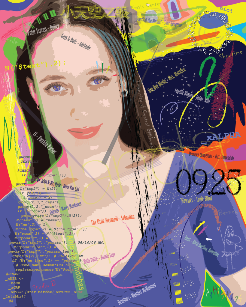 In 2000, David created a digital graphic of Luanda at age 15. This is a digital graphic of one of Luanda’s headshots from fall 2025. In it, it contains the roles and venues that Luanda played throughout her years until 2025 and early 2026.